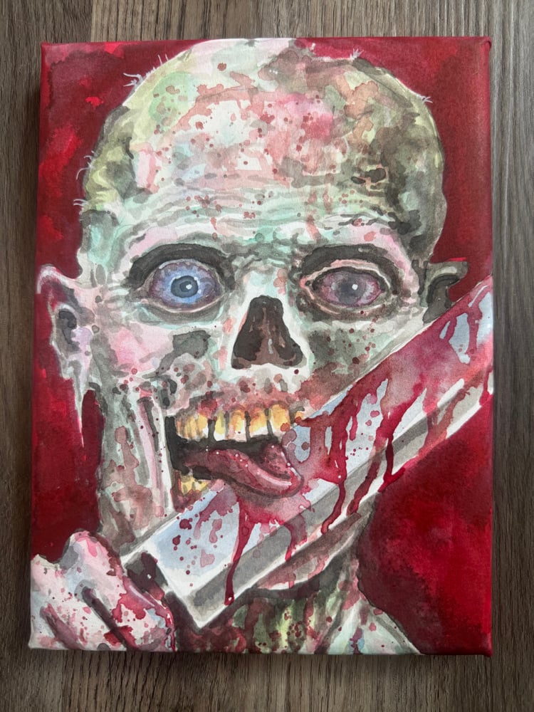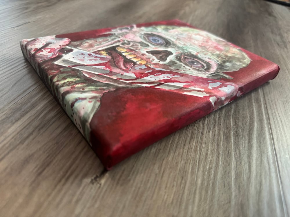 Tim Lehi “Blood Feast” painting. Ink and watercolor on watercolor canvas. size 6” X 8” X 1/2”.